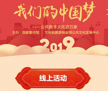 为进一步丰富和活跃春节期间群众文化生活,2019年春节期间,国家图书馆与文化和旅游部全国公共文化发展中心联合开展“我们的中国梦”——公共数字文化进万家线上活动,让公共数字文化工程融合服务更广泛地惠及基层群众。