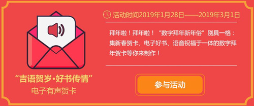 “我们的中国梦”——公共数字文化进万家线上活动时间为2019年春节期间(2019年1月28日至3月1日)。活动内容包括“今昔巨变·辉煌见证”新老照片征集、 “吉语贺岁·好书传情”电子有声贺卡、“书香博闻·欢启归程”在线趣味答题。本次活动继续与各地图书馆联动,既可通过扫码参加,也可通过公众号参加,通过栏目“新春活动”点击进入。