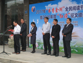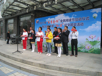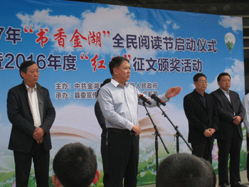 我县今天在图书馆广场隆重举重“书香金湖全民阅读节启动仪式暨2016年度‘红读’征文颁奖活动”。副县长高昌萍主持了这一活动。县文广新局局长柏常青介绍了2016年度我县全民阅读开展情况。仪式上县四套班子领导为2016年度获得江苏省“红领巾读书”征文比赛一、二、三等奖选手代表进行了颁奖,金湖县图书馆获得省组织奖。最后,县委常委、宣传部长周广峰对2017年书香金湖全民阅读活动提出了要求。