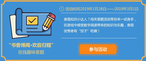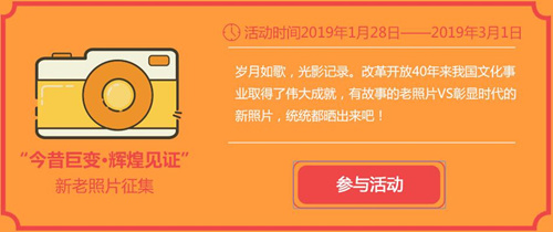 “我们的中国梦”——公共数字文化进万家线上活动时间为2019年春节期间(2019年1月28日至3月1日)。活动内容包括“今昔巨变·辉煌见证”新老照片征集、 “吉语贺岁·好书传情”电子有声贺卡、“书香博闻·欢启归程”在线趣味答题。本次活动继续与各地图书馆联动,既可通过扫码参加,也可通过公众号参加,通过栏目“新春活动”点击进入。